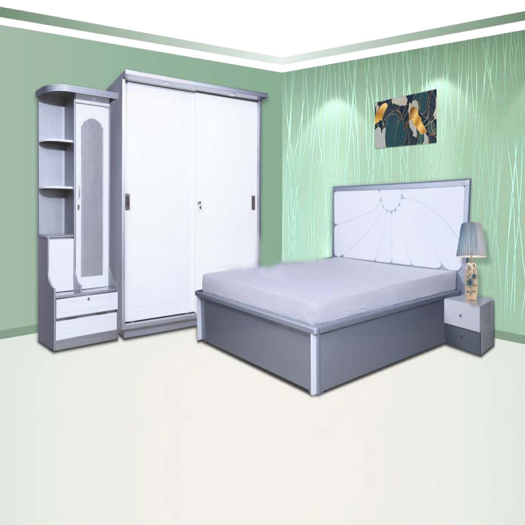 King Size Bed (7872) GREYSON FULL HD 1900( W)x1200(H)x2100(D ) White+Grey Wardrobe 2 Door Shova W2D Sliding 1200( W)x2020(H)x730(D ) Dresser White+Grey Sierra (D T-12) 800( W)x1870(H)x380(D ) White+Grey Side Table Sparkle (ST-2DR) 455( W)x400(H)x420(D ) White+Grey